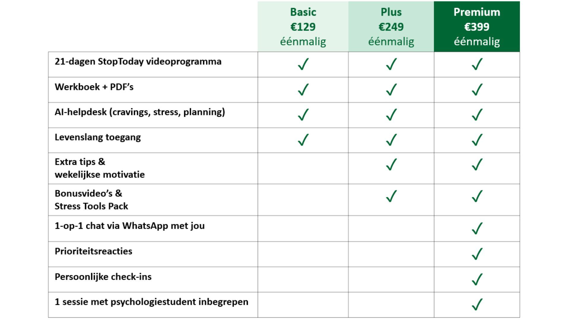 En wil je maximale ondersteuning met persoonlijke check-ins, WhatsApp-contact en een extra sessie met een psychologiestudent, dan geeft Premium je de meest complete begeleiding naar een rookvrij leven.